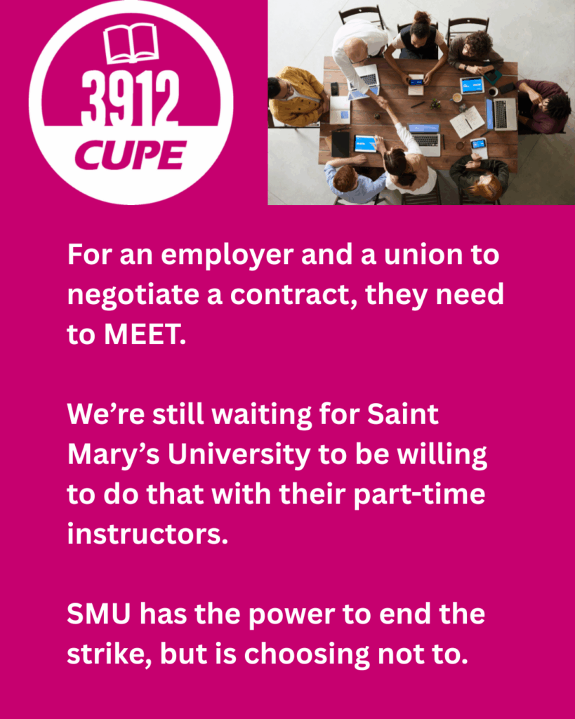April 10, 2024: Pursuant to Article 25.01 of the current CUPE/SMU Collective Agreement, the CUPE Local 3912 Part-Time Faculty bargaining unit advised the Employer of our desire to commence bargaining to renew the Collective Agreement which expires August 31, 2024. We offered some dates when the Negotiating Committee was available to meet with the Employer and asked them to provide alternate meeting dates for consideration if they were unavailable on the dates provided.